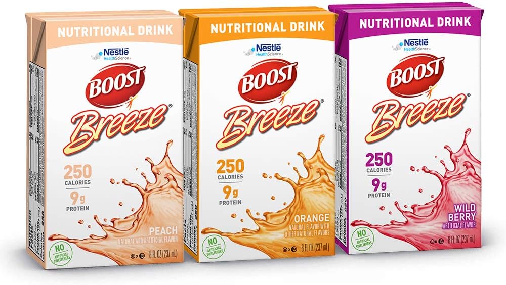 Variety Pack also available. Each 8 fl oz serving of our BOOST Breeze clear liquid nutritional drink provides 9 grams of high quality protein and 250 calories to help sustain energy and maintain muscle mass making it easy to drink and even easier to like. Boost Breeze Tropical Juice drink NO- AVOID THESE Alcoholic beverages Milk Smoothies Milkshakes Cream Orange juice Grapefruit juice Tomato juice Soup other than clear broth Cooked cereal Juice Popsicles or Title.